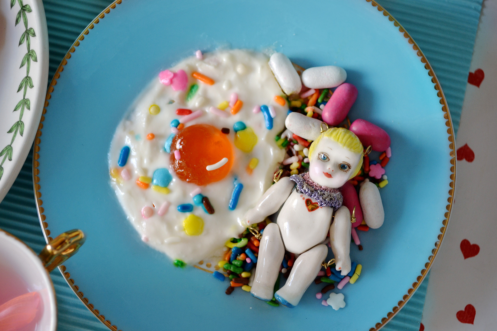 In this reinterpretation, Burns blurs the lines between the delightful and the disturbing, much like the Flemish masters did in their intricate still lifes. The sweet, inviting appearance of the candies and pastries is juxtaposed with the unsettling presence of insects, creating a tension that speaks to the contradictions in our dietary choices. While sugars are visually and tastefully appealing, they carry hidden dangers, much like the toxicity that lurks behind their sweetness.